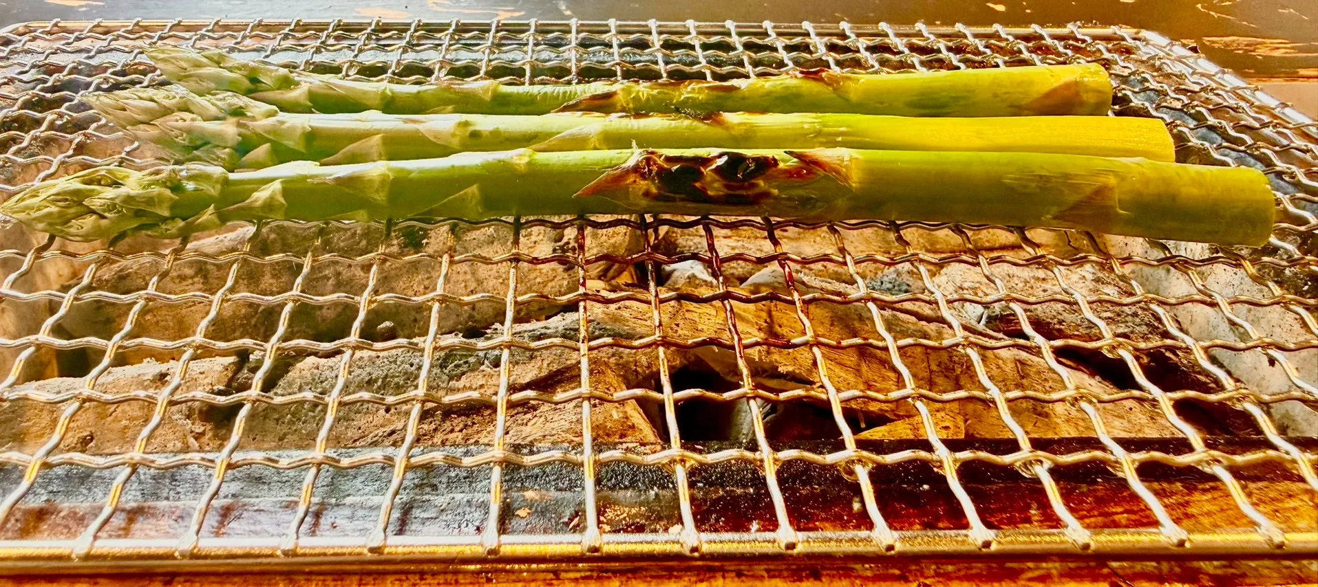 炭火の遠赤外線がアスパラガスの水分と甘みを内側に閉じ込め、そこへ白老牛から溶け出した芳醇な脂が優しくコーティングしていきます。最後に炭火の香ばしい煙が全体を包み込めば、二つの個性が一つの傑作へと昇華する「究極のペアリング」の完成です。